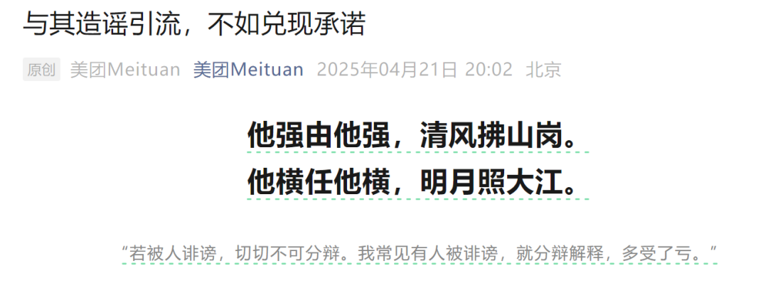 同时,美团官方发表了一篇简短的文章,写到:“他强由他强,清风拂山岗。他横任他横,明月照大江。”这一句出自金庸的《倚天屠龙记》。美团还在下方写到:“若被人诽谤,切切不可分辩。我常见有人被诽谤,就分辩解释,多受了亏。” 这里引用的是弘一法师的《格言别录》。