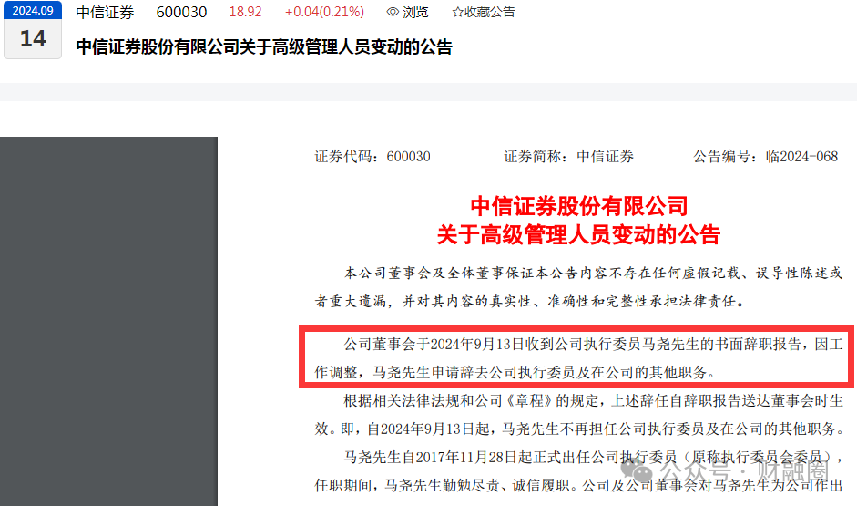 2024年9月13日,中信证券发布公告称,公司执行委员马尧因工作调整,辞去执行委员及在公司的其他职务。据券商中国记者从知情人士处了解,马尧将赴中信集团任职。
