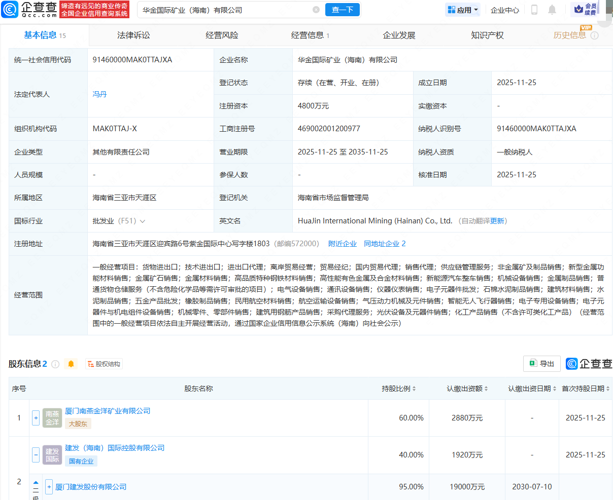 近日合法配资炒股线上,华金国际矿业(海南)有限公司成立,法定代表人为冯丹,注册资本为4800万元,经营范围包含:货物进出口;技术进出口;进出口代理;离岸贸易经营;贸易经纪;国内贸易代理等。企查查股权穿透显示,该公司由厦门南燕金洋矿业有限公司、建发股份(600153)旗下建发(海南)国际控股有限公司共同持股。